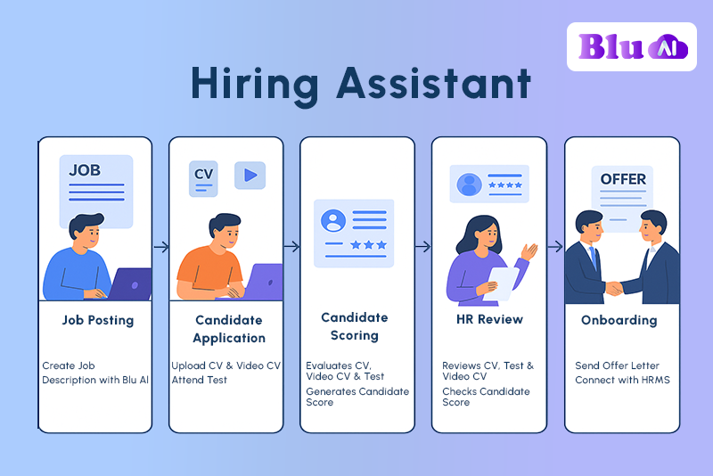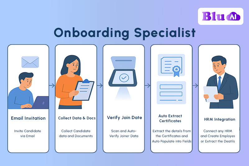 From generating role-specific onboarding forms to inviting candidates via email, collecting and verifying documents, and automating each step—GoBlu.AI ensures every new employee starts with clarity and confidence, making onboarding faster and smarter.